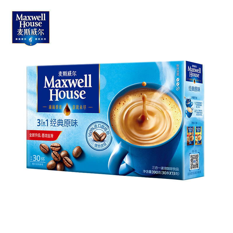麦斯威尔经典原味速溶三合一咖啡粉条装390g盒装