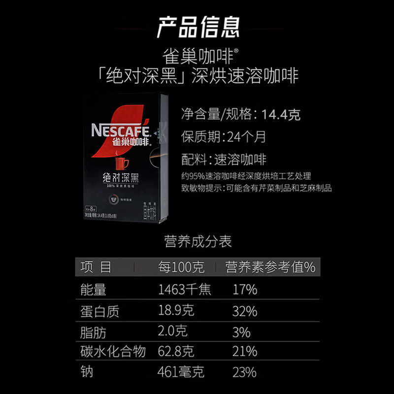 雀巢浓郁纯黑咖啡14.4g盒装装 速溶无蔗糖低脂冰美式黑咖啡冲饮