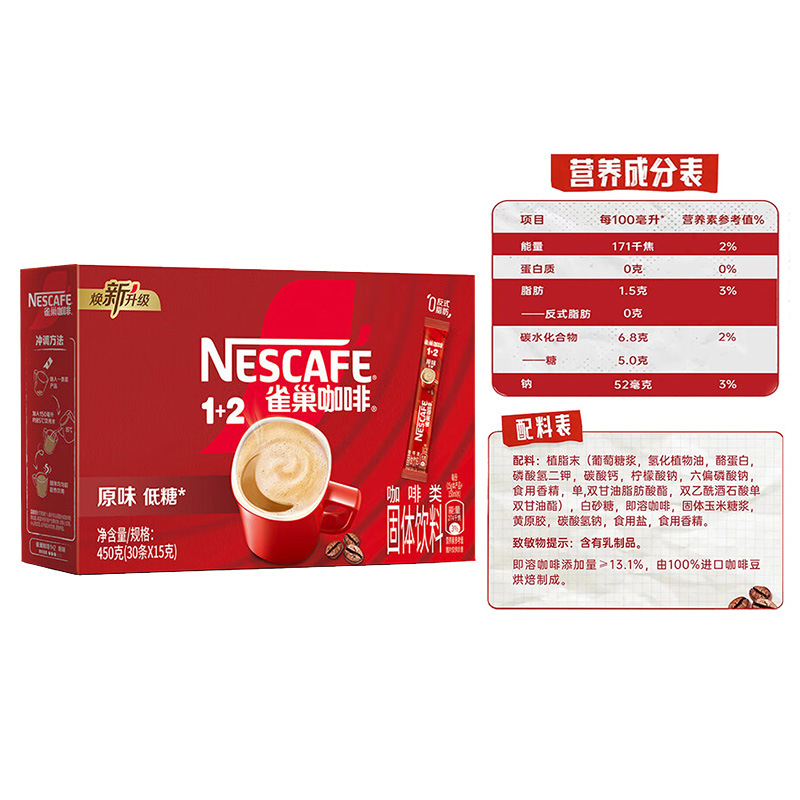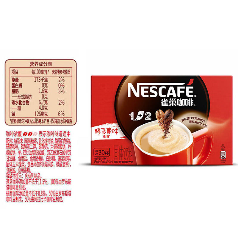 雀巢原味咖啡30条装 1+2 三合一速溶咖啡低糖配方即溶咖啡粉冲饮